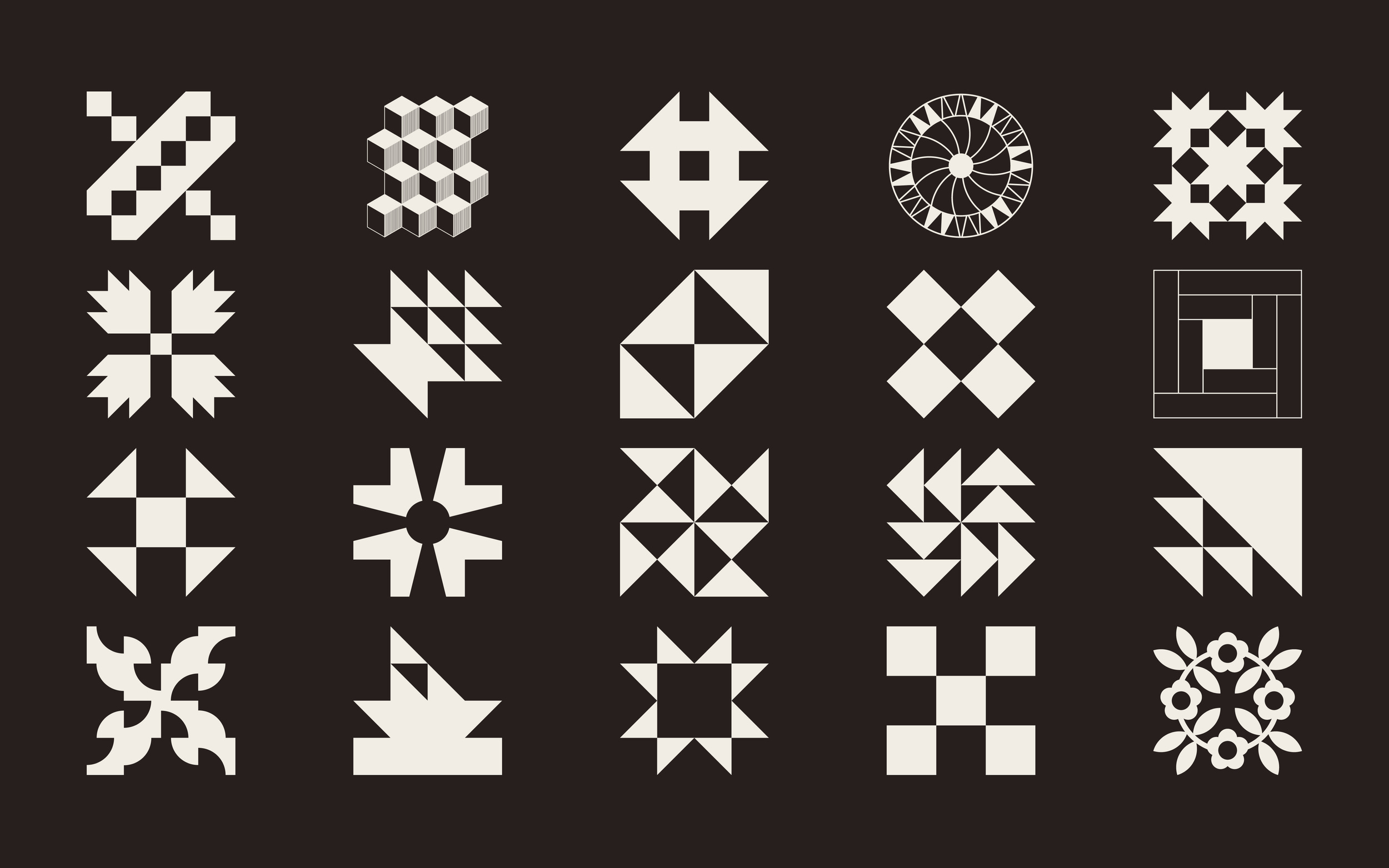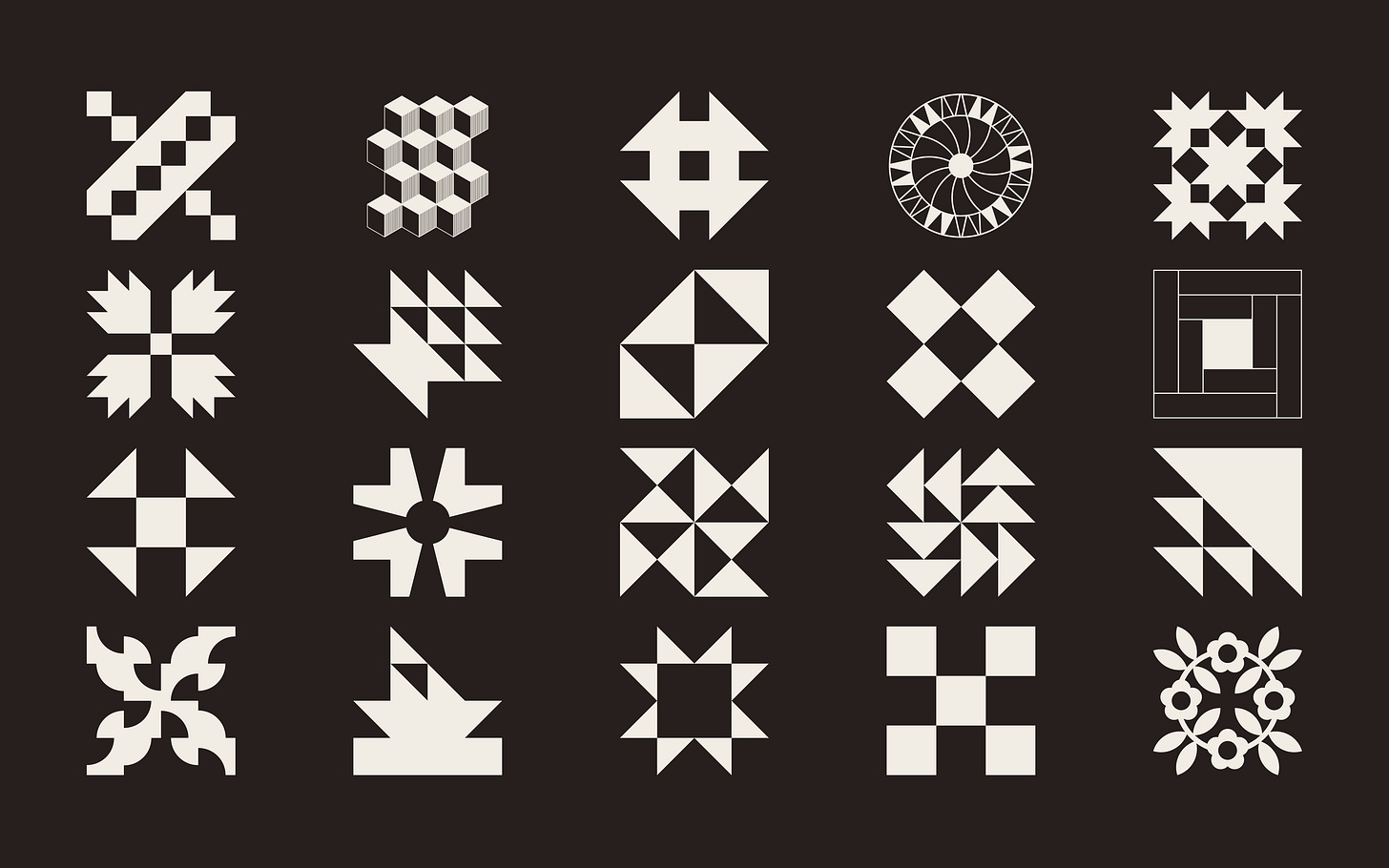 A display of the ‘blocks’ aka letters in VTC Harriet, a font based on the quilt messages of the Underground Railroad. The image (from vocaltype.com) shows all the different quilt squares included in the font.
