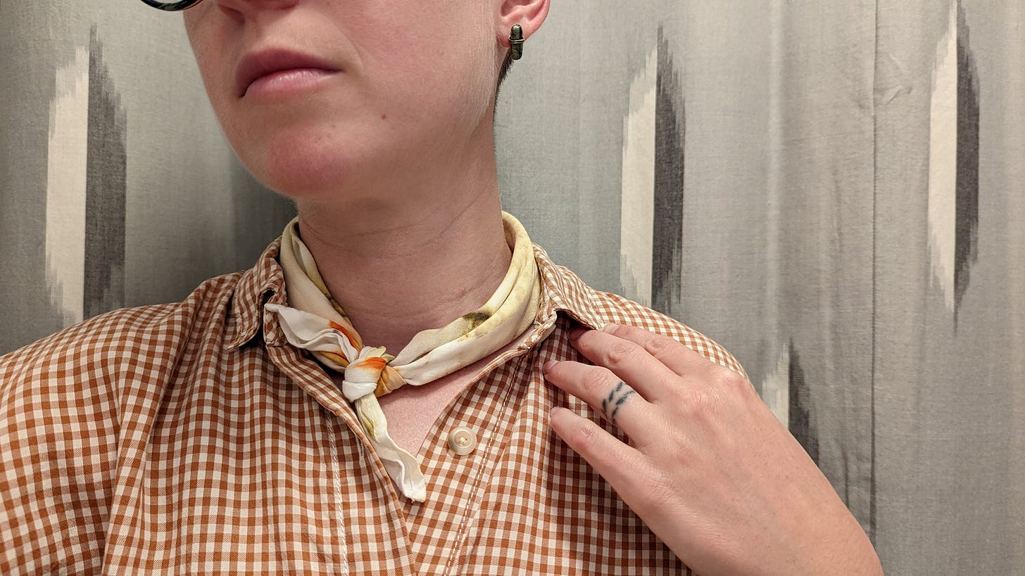 Me wearing my bundle dyed rayon scarf tied around my neck. I’m standing in front of a grey ikat curtain and wearing a brown gingham shirt. Only the bottom half of my face is visible.