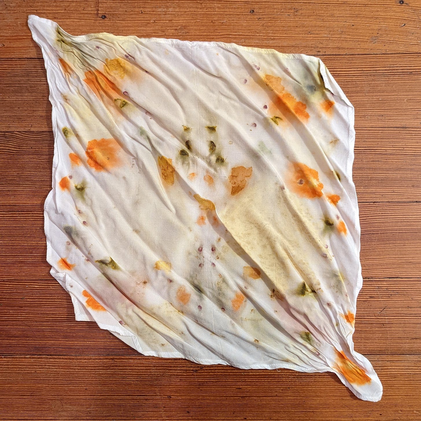 The well worn scarf, fold creases visible, laying on a hardwood floor. The scarf is white rayon with pops of orange and shades of yellow and olive.