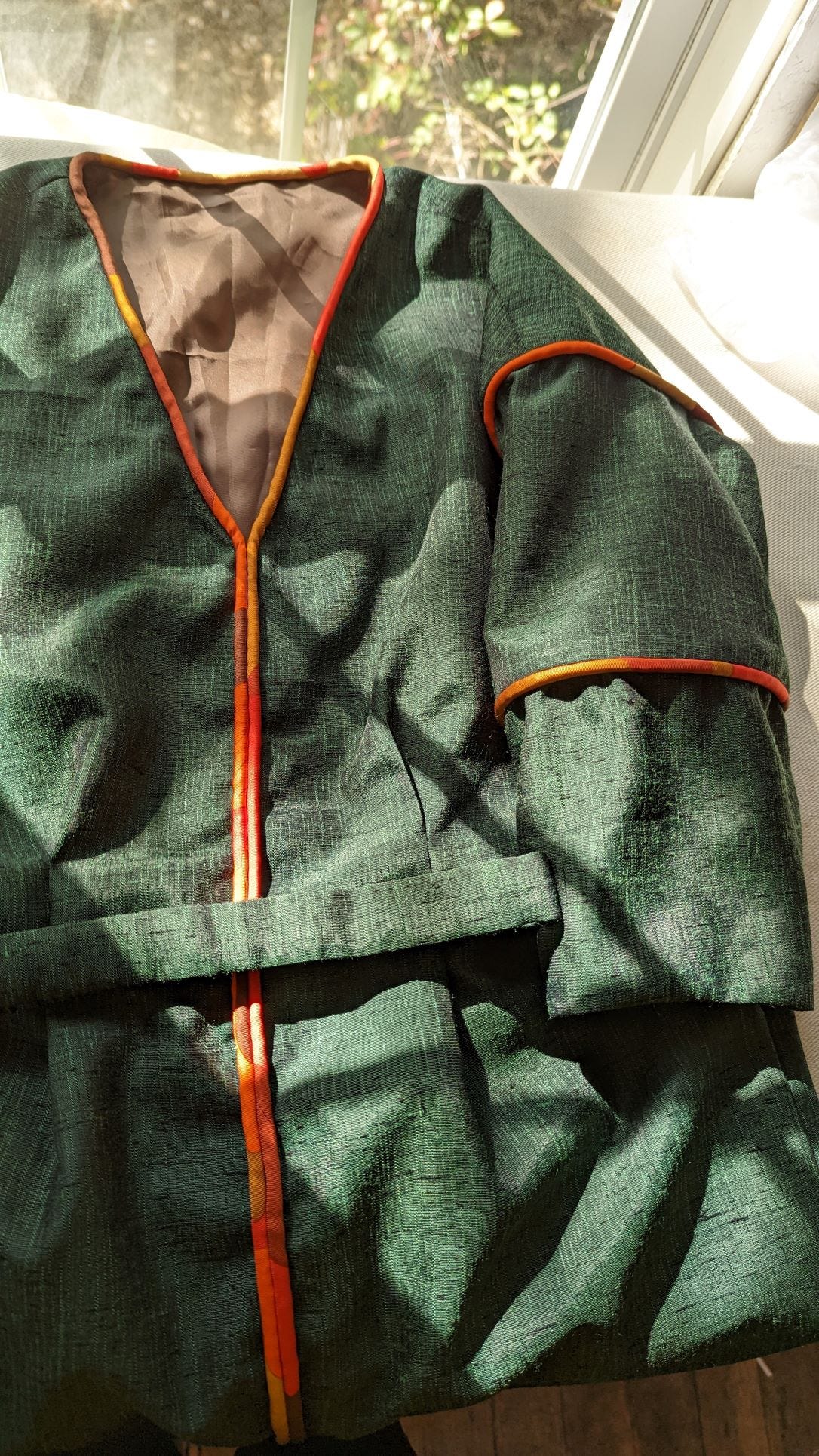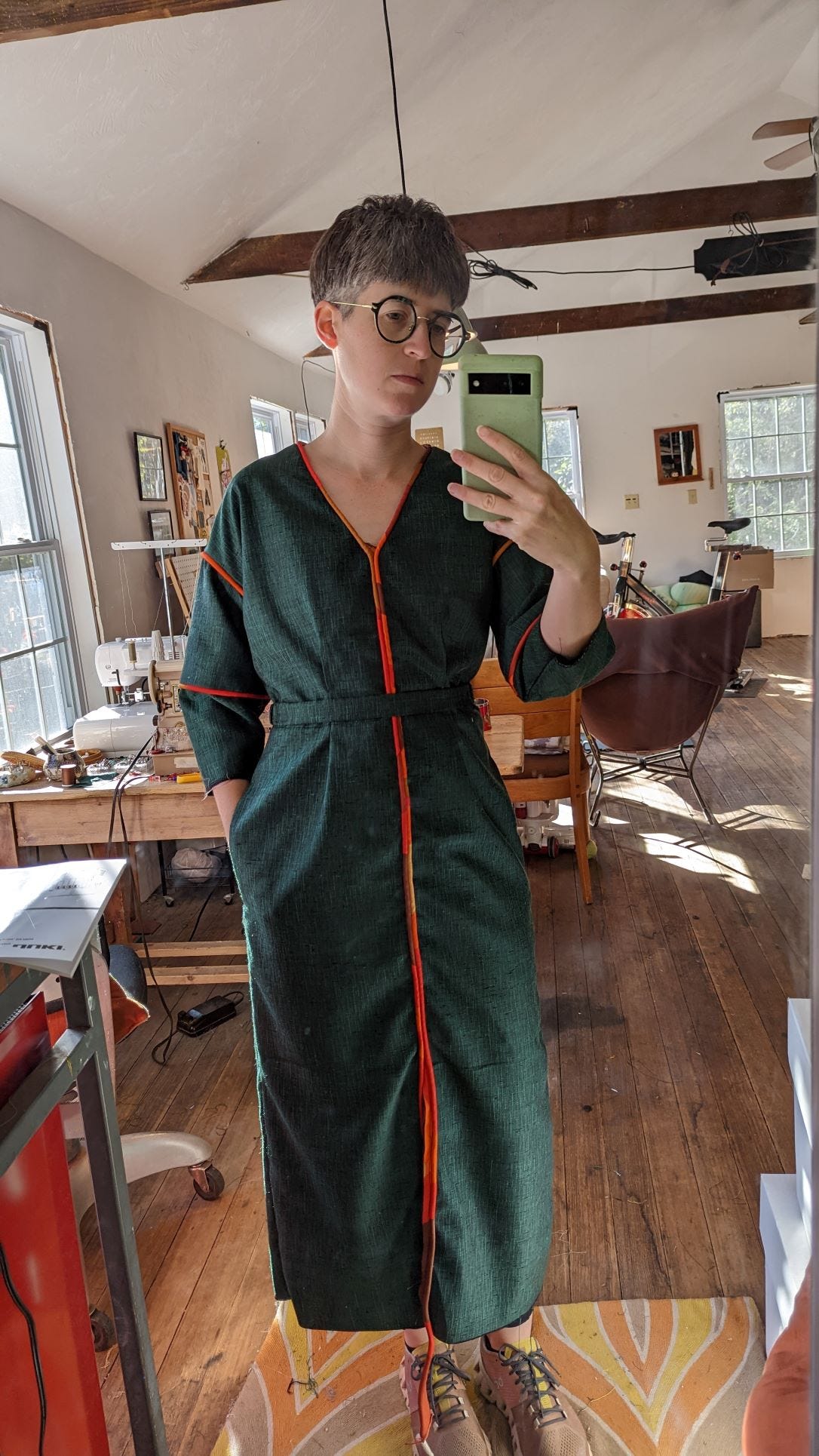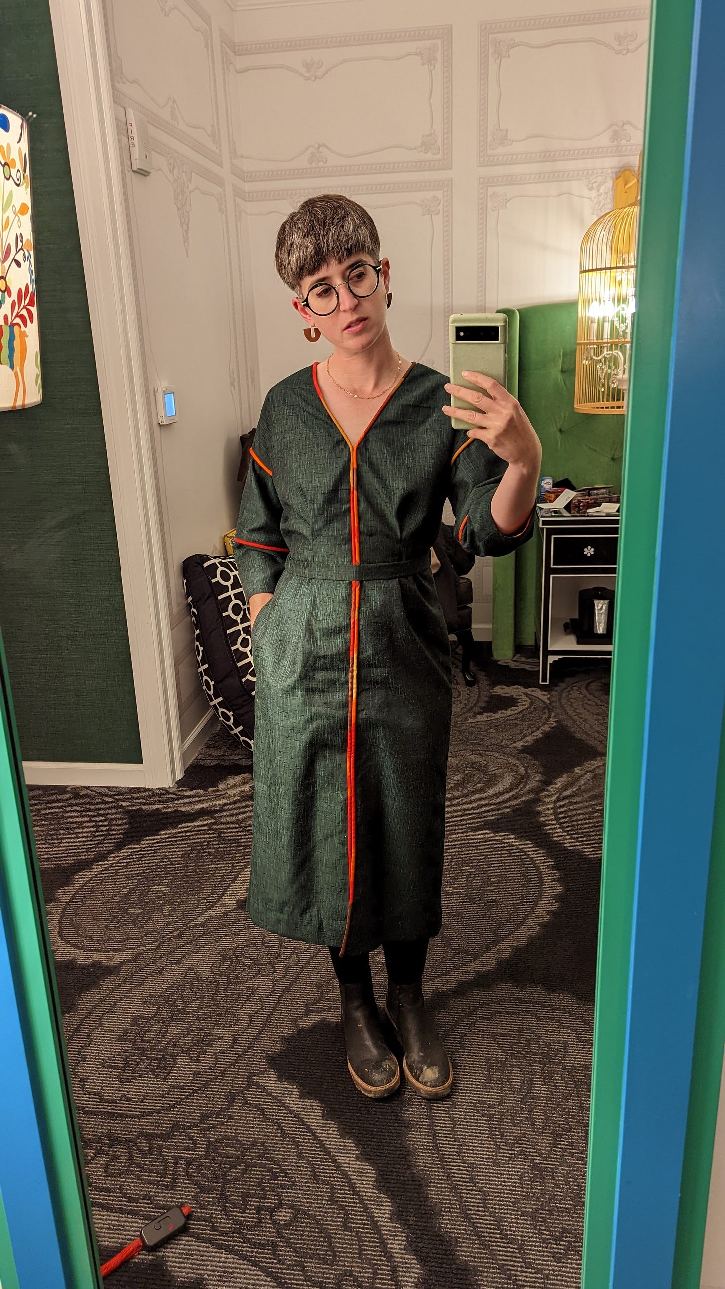 My dress for the wedding, a bit rumpled but looking chic. It is a green cross-weave textured fabric with a slight sheen, trimmed in silk piping in an abstract pattern of red, orange, gold, and brown. It is a boxy, drop shoulder silhouette with a fitted waist and lantern sleeves, featuring piping along the front seam and V-neck, as well as both sleeve seams. I’m wearing a thin gold chain and brass half circle earrings. My green marbled glasses with gold accents complete the look. (And yes, I do match the wallpaper!)